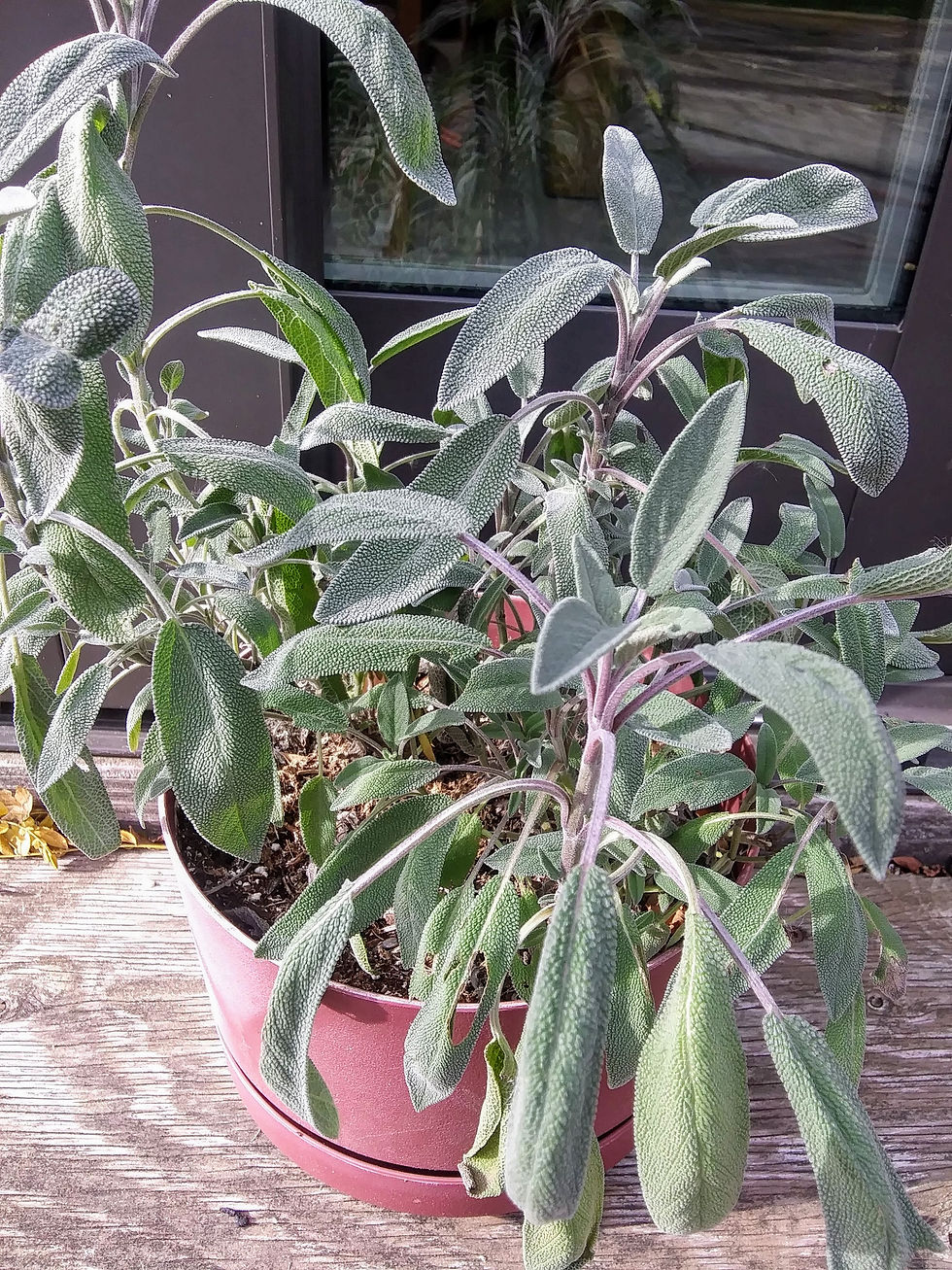 Another plant that is perhaps even more hardy for us is garden sage, Salvia officinalis. Not only is it able to survive a little frost, it actually seems to relish the challenge. Our current plant is in a pot on the deck. We have had snow, freezing rain, sun, no sun and, just to make it interesting, gales of wind in the forty to fifty mile an hour range. Despite the assaults, the plant continues to deliver. Eventually, we will relocate the pot indoors. The plant often gets a little cranky about more desirable conditions and goes dormant until we release it into the outdoors again.